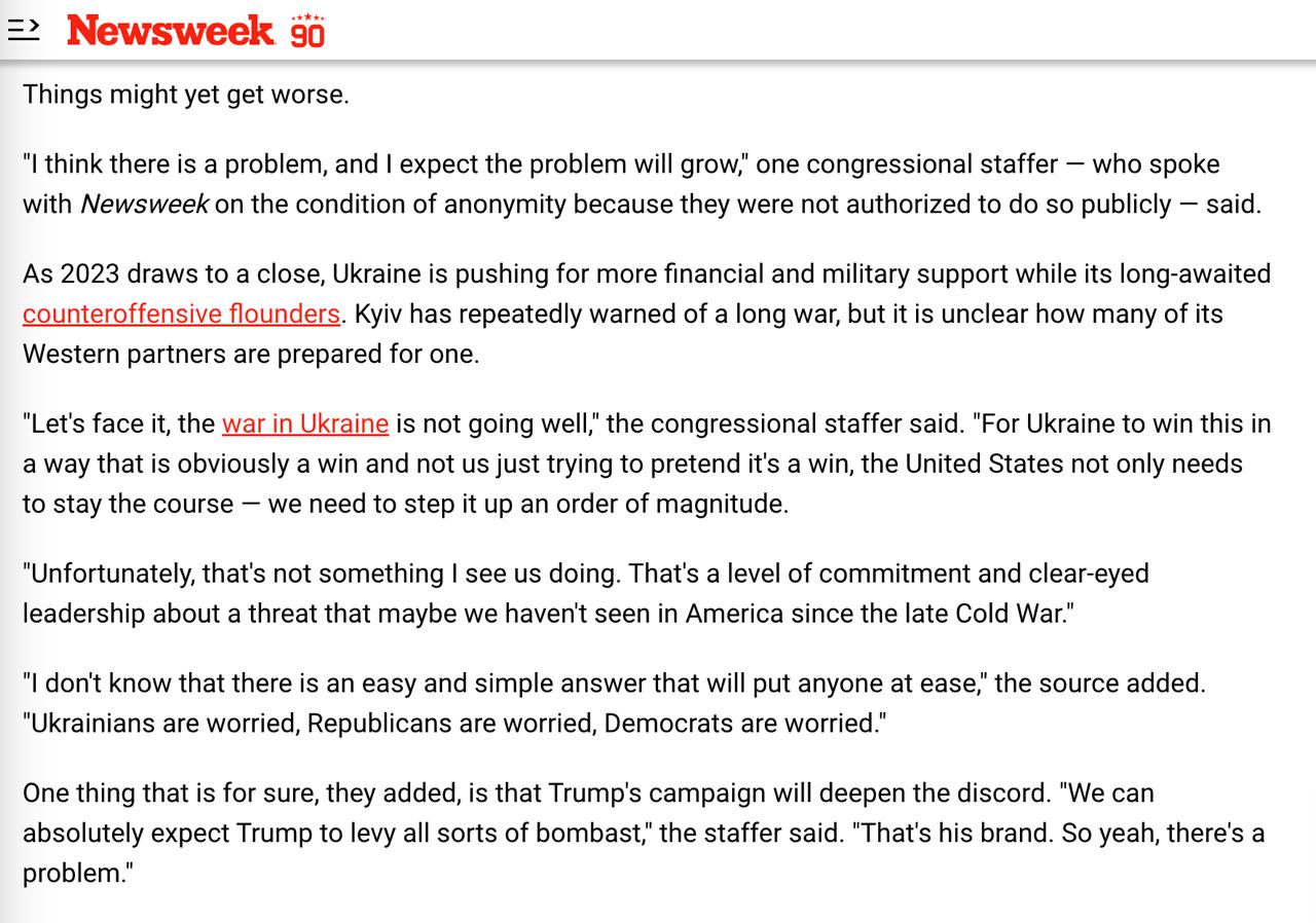 "Я думаю, что проблема существует, и я ожидаю, что проблема будет расти. Давайте посмотрим правде в глаза: война в Украине идет не очень хорошо. Чтобы Украина одержала победу таким способом, который, очевидно, является победой, а не тем, что мы просто пытаемся притвориться, что это победа, Соединенным Штатам необходимо не только придерживаться выбранного курса, нам нужно ускорить его на порядок. К сожалению, я не вижу, чтобы мы это делали. Это уровень приверженности и ясного лидерства в отношении угрозы, которую, возможно, мы не видели в Америке со времен конца холодной войны", - заявил источник издания.