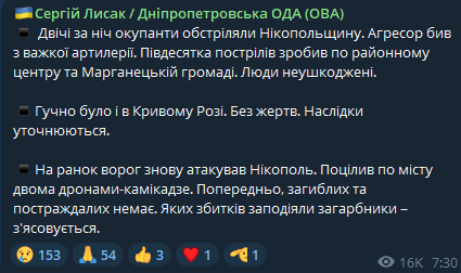 "Дважды за ночь оккупанты обстреляли Никопольщину. Агрессор избивал из тяжелой артиллерии. Полдесятка выстрелов произвел по районному центру и Марганецкой общине. Люди невредимы.