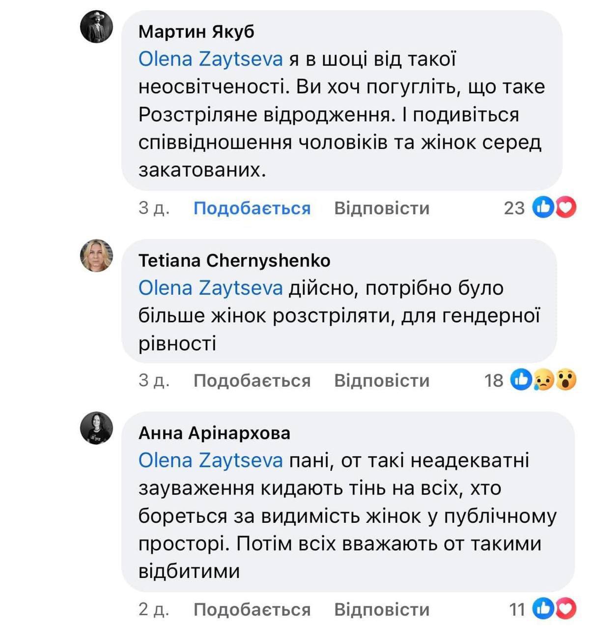 Так, пользователи возмущены самой постановкой вопроса: "Что, надо было больше женщин расстрелять?"; "Дайте им машину времени — так они еще 200 женщин расстреляют, чтобы поровну было, или что?"