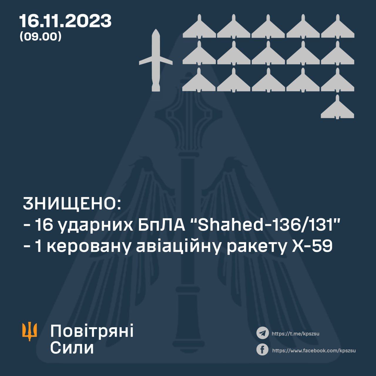 11.05 Воздушные силы публикуют отчет об утренней атаке "Шахедов". Из 18 дронов было сбито 16.