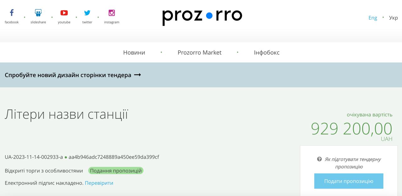 Речь о станциях "Зверинецкая" и "Площадь Украинских героев". Согласно тендеру, восемь комплектов букв должны быть изготовлены из "полированного анодированного алюминия светло-медного цвета с лаковым покрытием". Общая стоимость — 929,2 тысяч грн.
