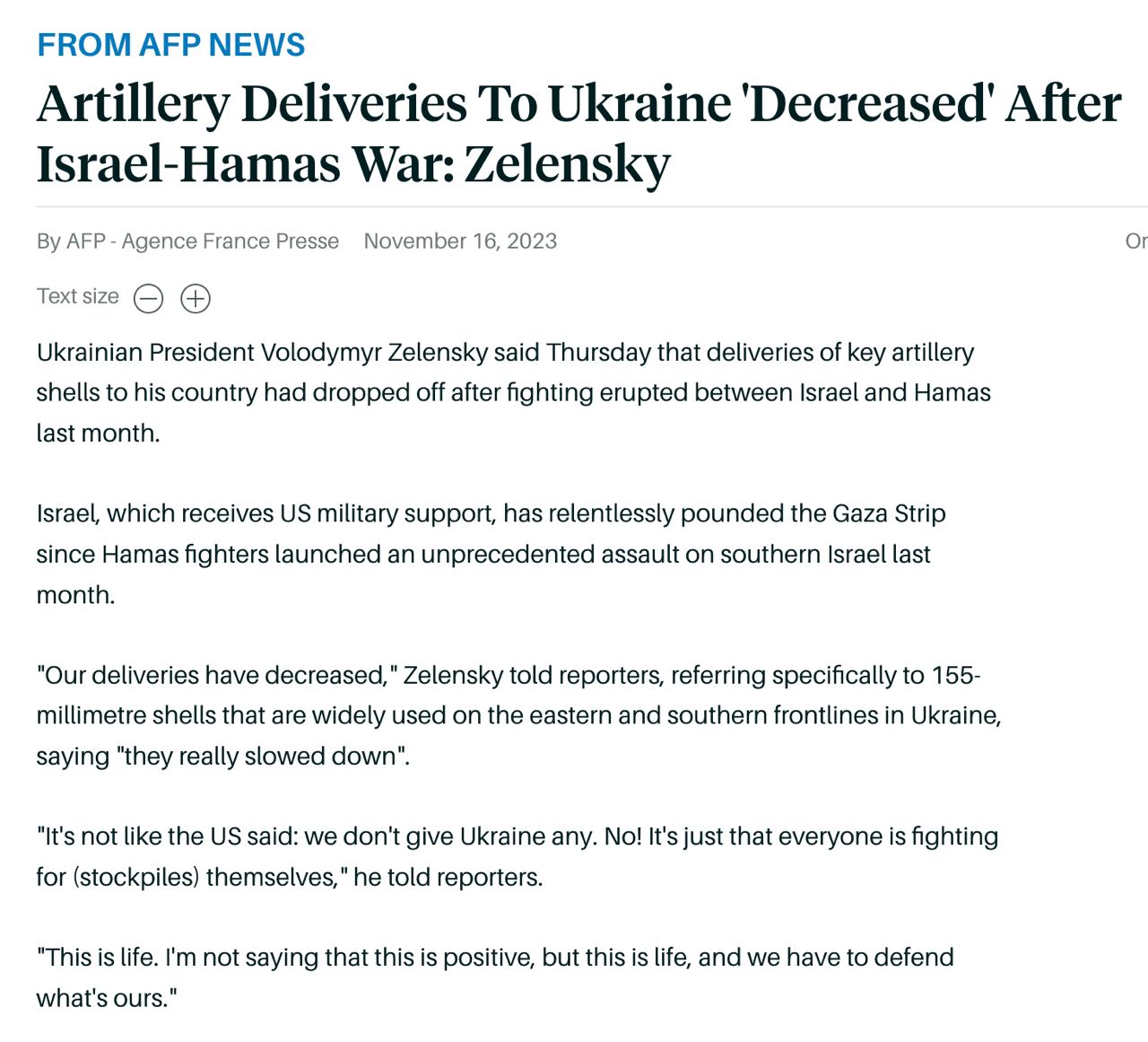 Поставки ключевых 155-миллиметровых артиллерийских снарядов в Украину сократились после начала войны Израиля с ХАМАС.