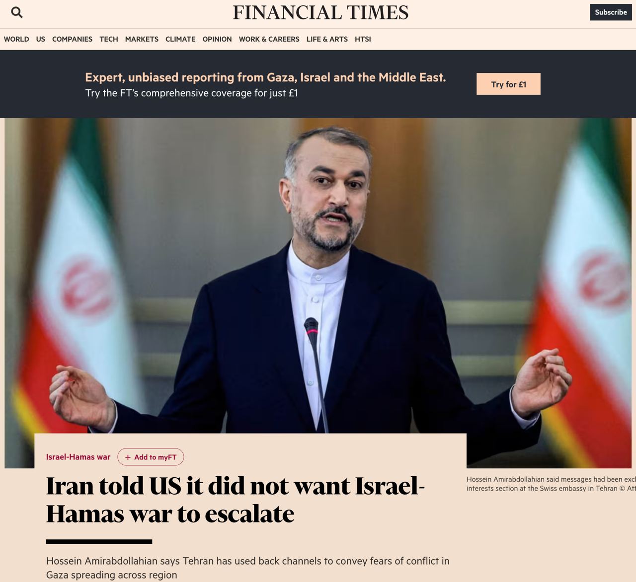 Иран заявил США по закрытым каналам через посольство Швейцарии, что не хочет эскалации войны Израиля с ХАМАС, но она будет неизбежна, если ЦАХАЛ продолжит военные действия.