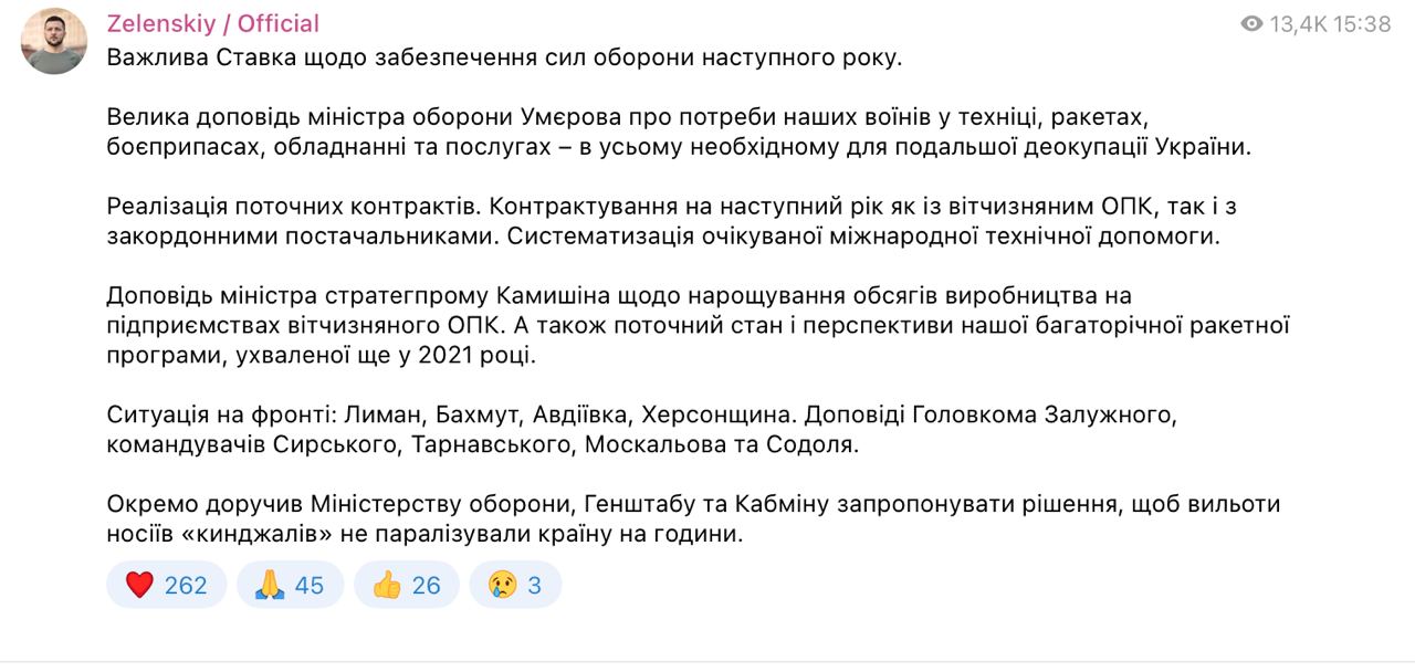 Об этом он сообщил в своем телеграм-канале по итогам заседания Ставки верховного главнокомандующего.