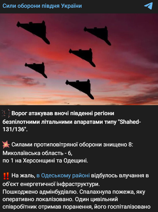 Сегодня ночью россияне атаковали южные регионы беспилотными летательными аппаратами типа "Shahed-131/136". В Одесском районе "Шахед" ударил по объекту энергетики. Загорелось админздание, есть пострадавший.