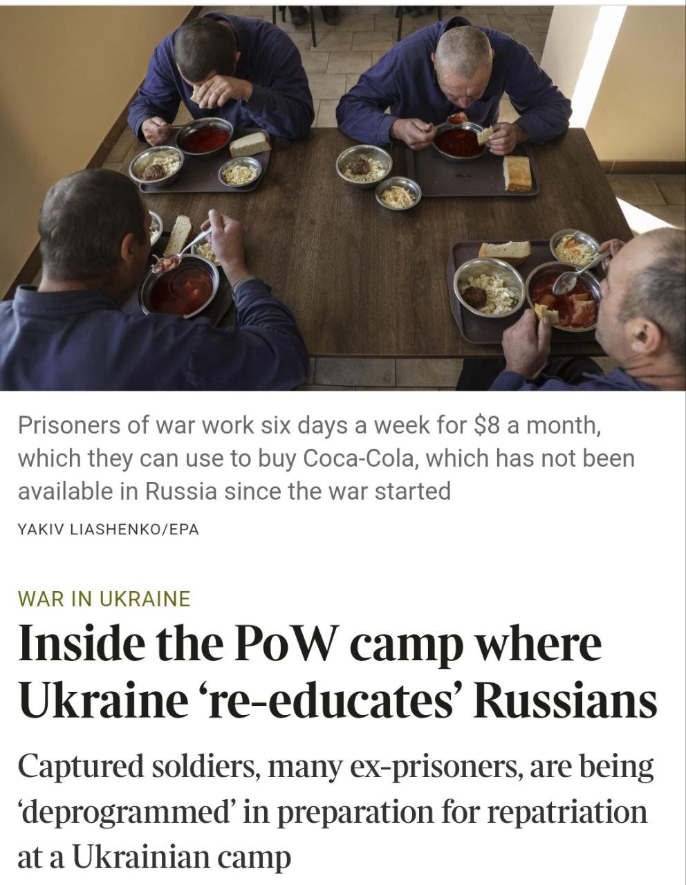 В статье говорится, что пленных будят в 6 утра под звуки украинского гимна через громкоговоритель, который выведен в каждое помещение. По пути в столовую заключенные должны пройти по аллее, увешанной фотографиями Степана Бандеры и Тараса Шевченко.