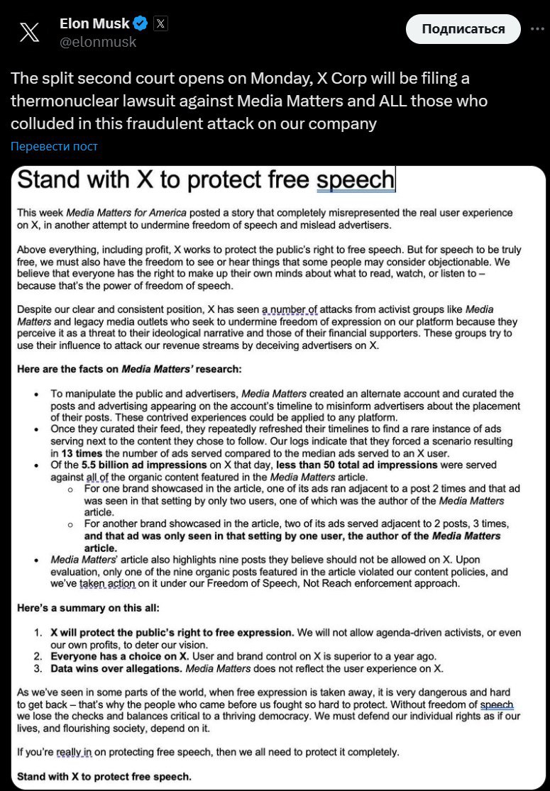 "В понедельник за долю секунды будет открыт иск. X Corp подает термоядерный иск против СМИ и всех, кто участвовал в этом мошенническом нападении на нашу компанию", - написал Илон Маск.