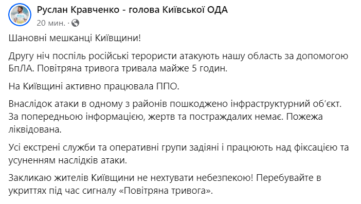 09:10 В Киевской области после ночной атаки беспилотников поврежден объект инфраструктуры.