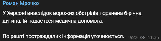 11:48 В результате российского обстрела Херсона ранение получил шестилетний ребенок. Ему оказывают медицинскую помощь, сообщил руководитель МВА Роман Мрочко.