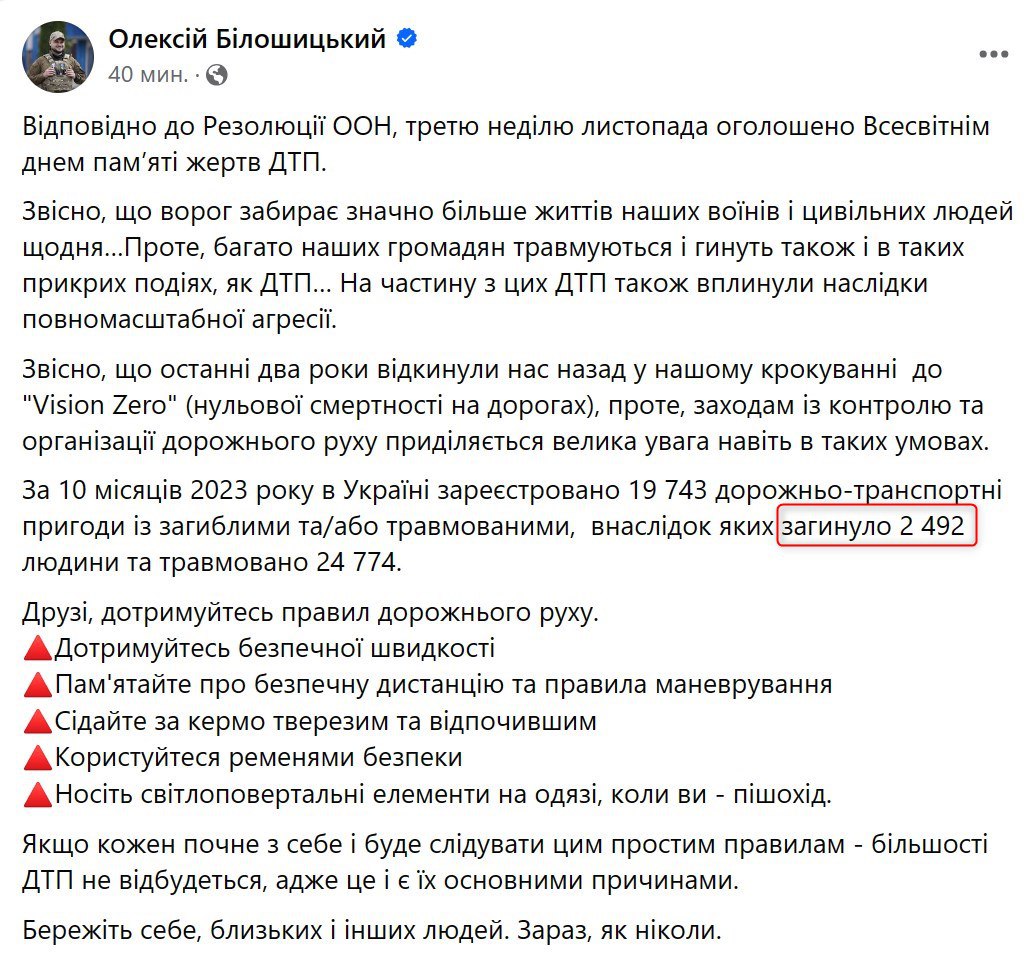 "За 10 месяцев 2023 года в Украине зарегистрировано 19 743 ДТП с погибшими и/или травмированными, в результате которых погибли 2 492 человека и травмированы 24 774", - написал Белошицкий.