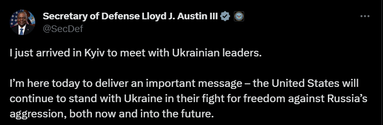 "Я только что приехал в Киев, чтобы встретиться с украинскими лидерами. Я здесь сегодня, чтобы передать важное послание: Соединенные Штаты будут продолжать поддерживать Украину в ее борьбе за свободу против российской агрессии, как сейчас, так и в будущем", - написал он.