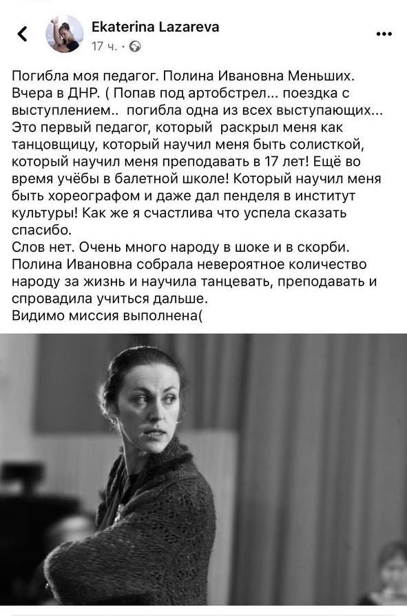 16.54 В Старобешево (захваченная россиянами часть Донецкой области, 40 километров от линии фронта) в результате прилета погибла российская актриса Полина Меньших, пишут российские паблики.