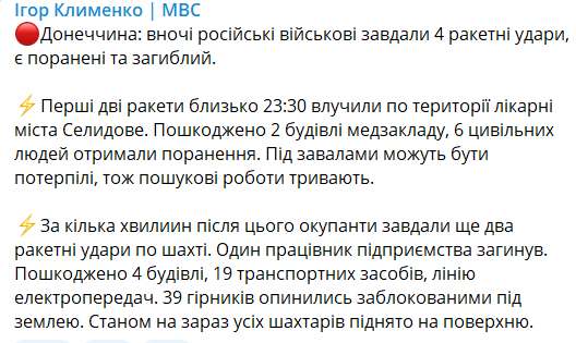 "Первые две ракеты около 23:30 попали по территории больницы города Селидово. Повреждены 2 здания медучреждения, 6 гражданских людей получили ранения", - написал он.