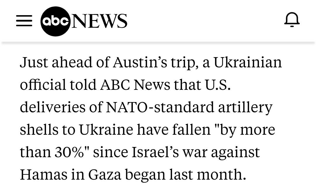 Ранее президент Украины Владимир Зеленский заявил, что поставки ключевых 155-миллиметровых артиллерийских снарядов в Украину сократились после начала войны Израиля с ХАМАС.