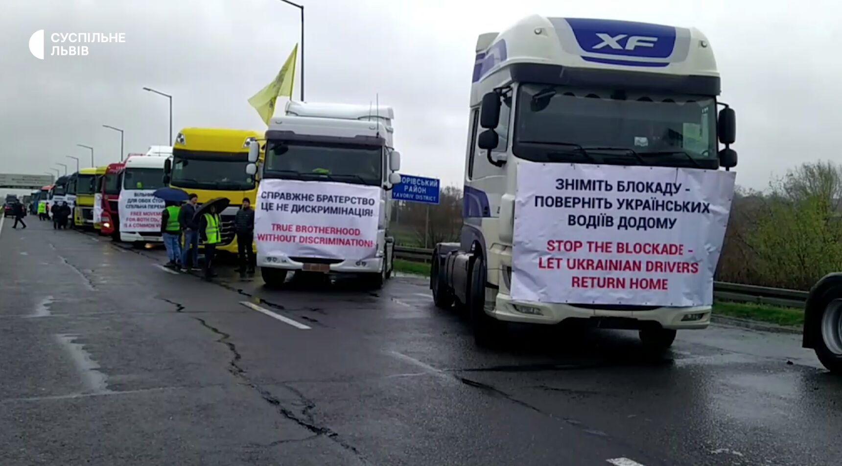 Перевозчики разместили на грузовиках плакаты: "Снимите блокаду - верните украинских водителей домой", "Настоящее братство - это не дискриминация", "Вместе сильнее", а также "Потеряет Украина - будет терять Польша" на украинском и английском языках.
