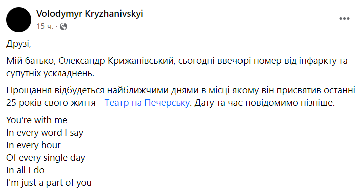 В театре также сообщили о смерти Александра Крыжановского.