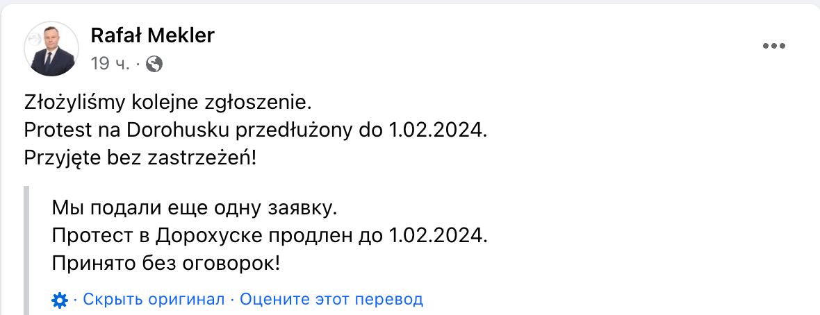Блокада границы продлится как минимум до 1 февраля 2024 года. Фото: Facebook