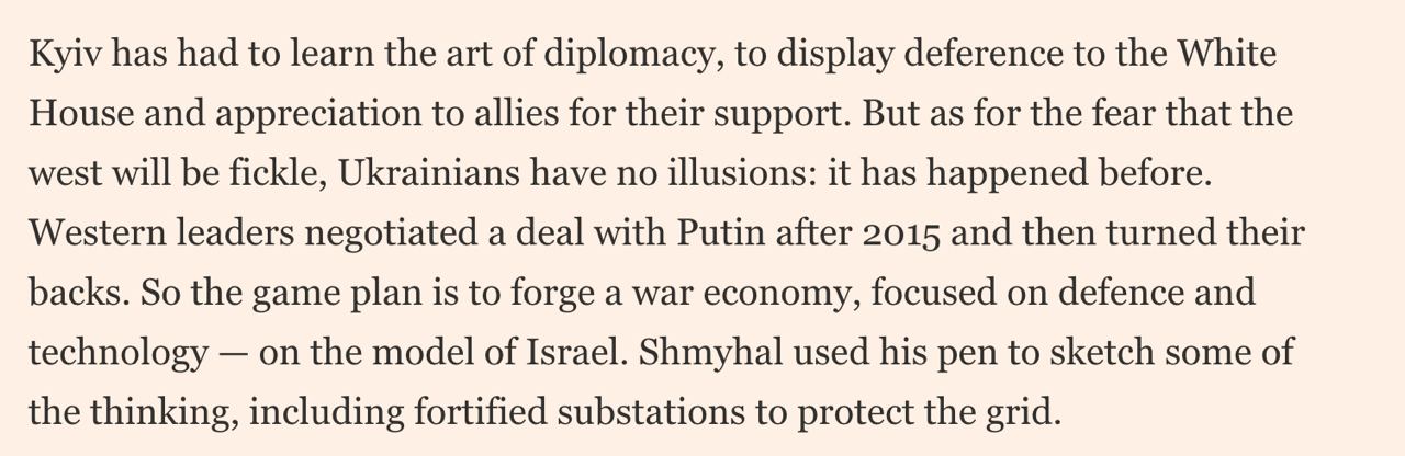 И все достижения Израиля, которые сейчас служат образцом для подражания, были достигнуты благодаря тому, что страна имела совокупно десятилетия жизни без полномасштабной войны, когда она могла привлекать инвестиции, строить военные заводы, не опасаясь, что их (вместе с близлежащей электростанцией) разбомбят на следующий день после открытия, заниматься развитием экономики и технологий силами сотен тысяч и миллионов израильтян, которым не нужно было годами сидеть в окопах. Все это Украина в принципе не может реализовать во время войны нынешнего масштаба.