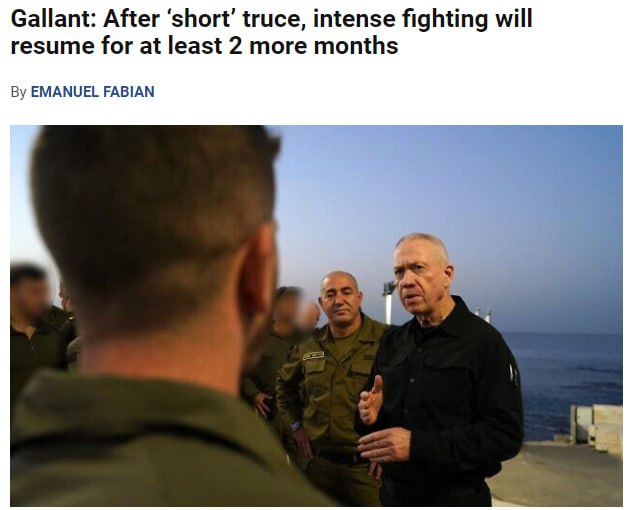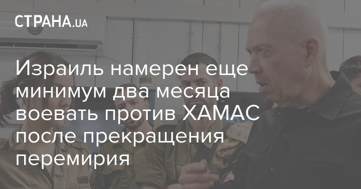 Министр обороны Израиля Йоав Галлант заявил, что как только закончится короткое временное перемирие с ХАМАС, военные возобновят боевые действия интенсивно, и они продлятся еще как минимум два месяца.