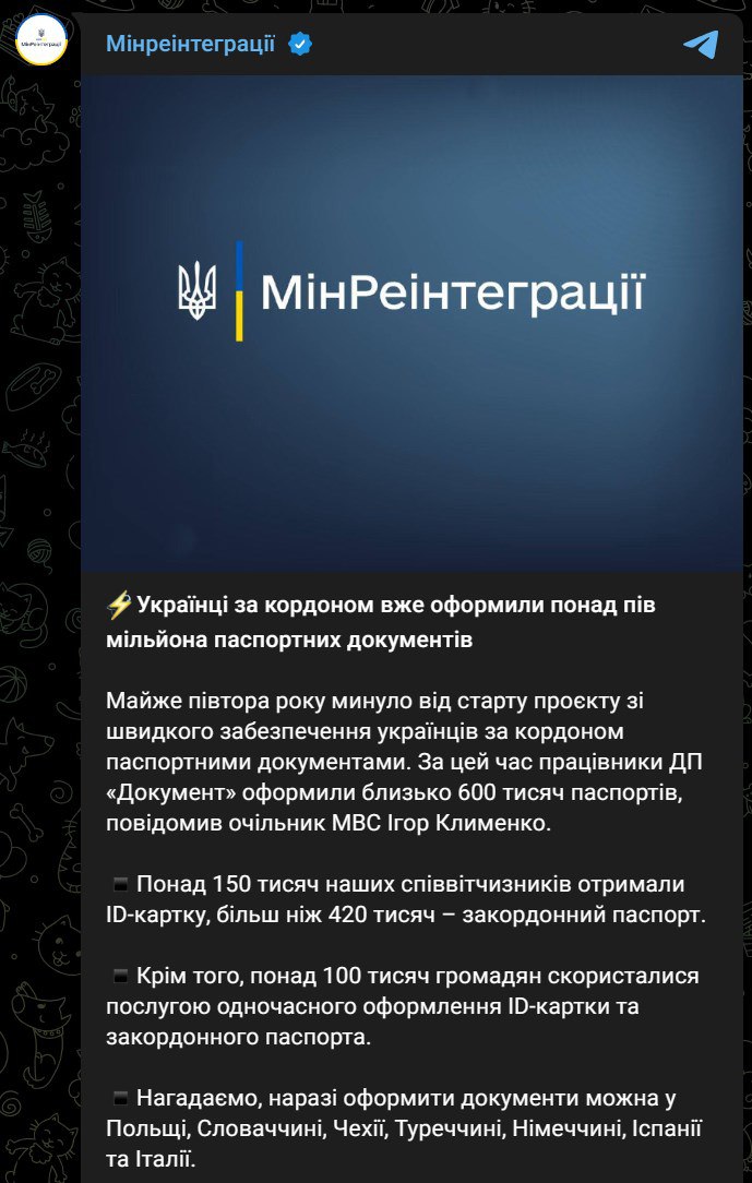 За время войны украинцы за границей уже оформили около 600 тысяч паспортов. Об этом сообщило министерство реинтеграции со ссылкой на главу МВД Игоря Клименко.