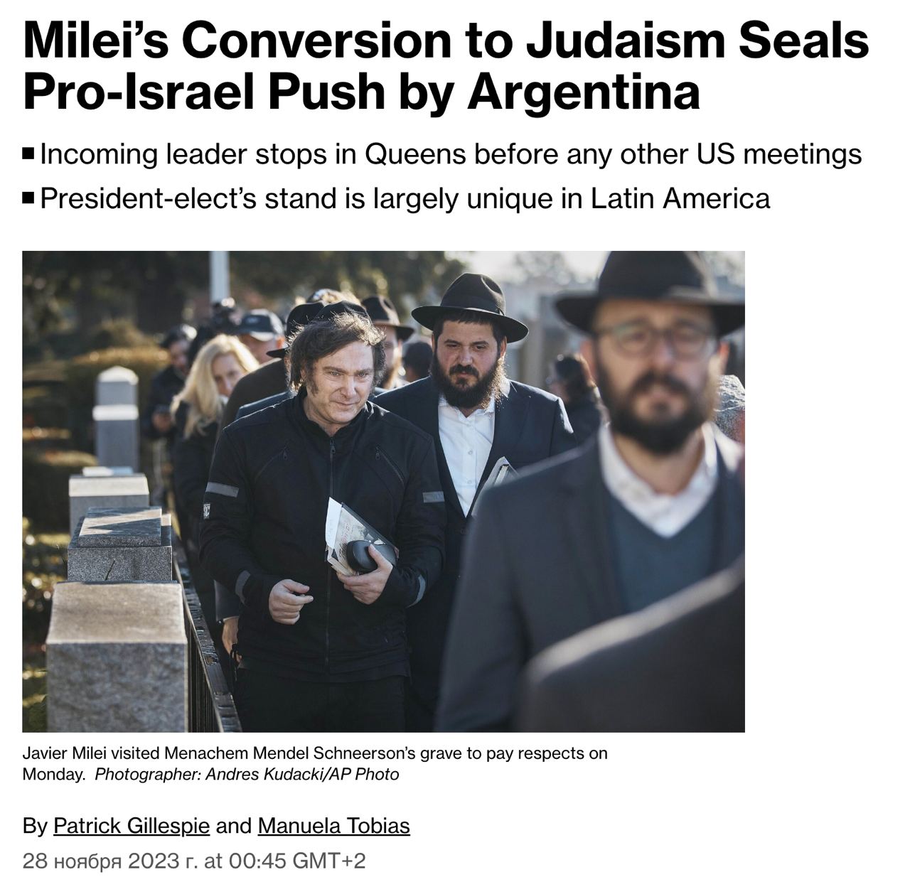 Новоизбранный президент Аргентины Хавьер Милей переходит в иудаизм. По прибытию в Нью-Йорк (это его первая зарубежная поездка) он направился к могиле известного ортодоксального еврейского раввина Менахема-Мендел Шнеерсона.