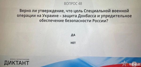 Например, участников диктанта спрашивают следующее: "Верно ли утверждение, что цель специальной военной операции - защита Донбасса и упредительное обеспечение безопасности России?"