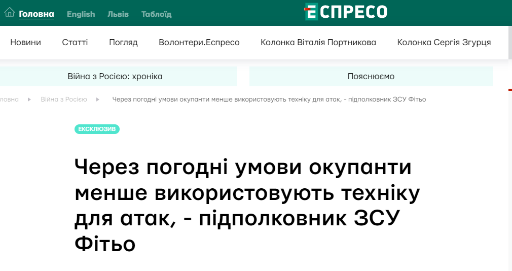 "Конечно, погода внесла свои коррективы в ход боевых действий. Россияне стали меньше использовать тяжелую технику для атак на украинские позиции, поскольку продвигаться по такой почве почти невозможно. Соответственно, на тех участках фронта, где большая дистанция между позициями, противник использовал технику для организации штурмов. В частности, подвозили личный состав, который потом бросали на штурмовые действия. Сейчас таких маневров у оккупантов стало меньше из-за ухудшения погодных условий", - рассказал Фитьо.