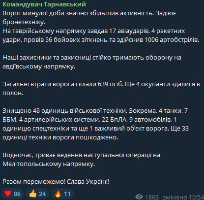 Между тем командующий направлением Александр Тарнавский сообщил, что армия РФ за минувшие сутки значительно "увеличила активность" на таврическом направлении, но ВСУ "стойко удерживают оборону" под Авдеевкой.
