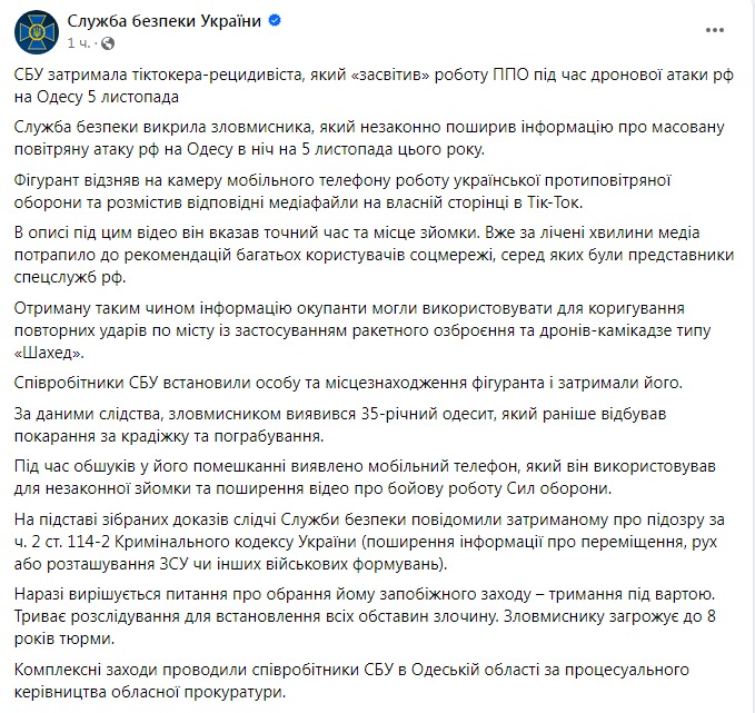 По данным СБУ, мужчина снял на камеру мобильного телефона работу украинской противовоздушной обороны и опубликовал видео на своей странице в ТикТок. В описании под этим видео он указал точное время и место съемки.