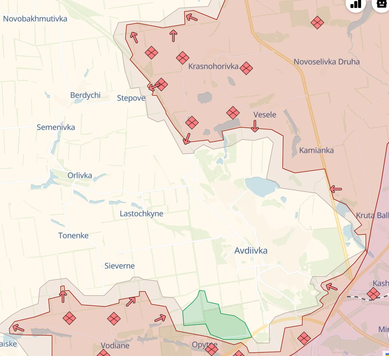 На Авдеевском участке россияне закрепляются в восточных окрестностях Степного (это к северо-западу от Авдеевки) и пытаются продвигаться по селу на запад. Также они пытаются обходить Степное с северного фланга  с целью выйти на северные окраины Бердычей, пишет Deep State.