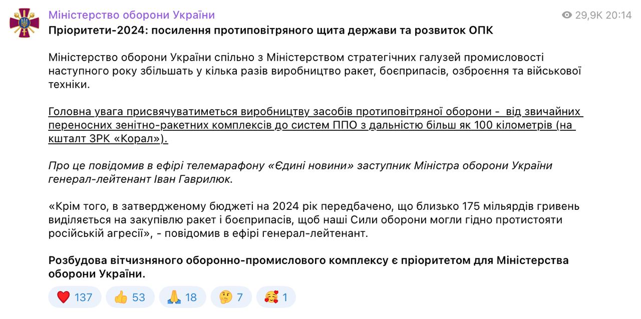 Министерство обороны Украины заявило о планах увеличить производство ракет, боеприпасов, вооружения и военной техники в следующем году "в несколько раз".