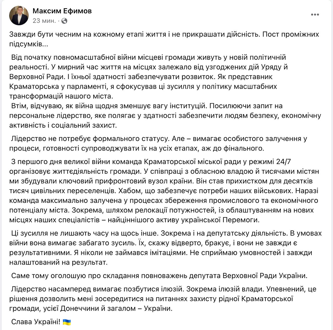 "С первого дня войны команда Краматорского городского совета в режиме 24/7 организует жизнедеятельность общины. В сотрудничестве с областными властями и тысячами горожан мы построили ключевой прифронтовый узел страны. Он стал пристанищем для десятков тысяч гражданских переселенцев... Эти усилия не оставляют времени на что-либо другое. В том числе и на депутатскую деятельность. В условиях войны она требует много усилий. Их, скажу откровенно, не хватает, и они не всегда результативны. Я никогда не занимался имитациями. Не воспринимаю условностей и всегда настроен на результат. Именно поэтому объявляю о сложении полномочий депутата Верховной Рады Украины", - сказано в посте Ефимова.