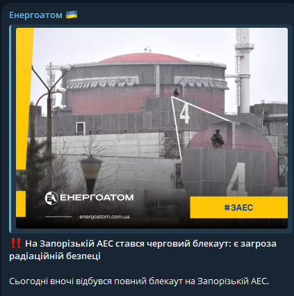 Полный блэкаут произошел на оккупированной Запорожской АЭС ночью 2 декабря. Это создает угрозу ядерной и радиационной безопасности на станции.