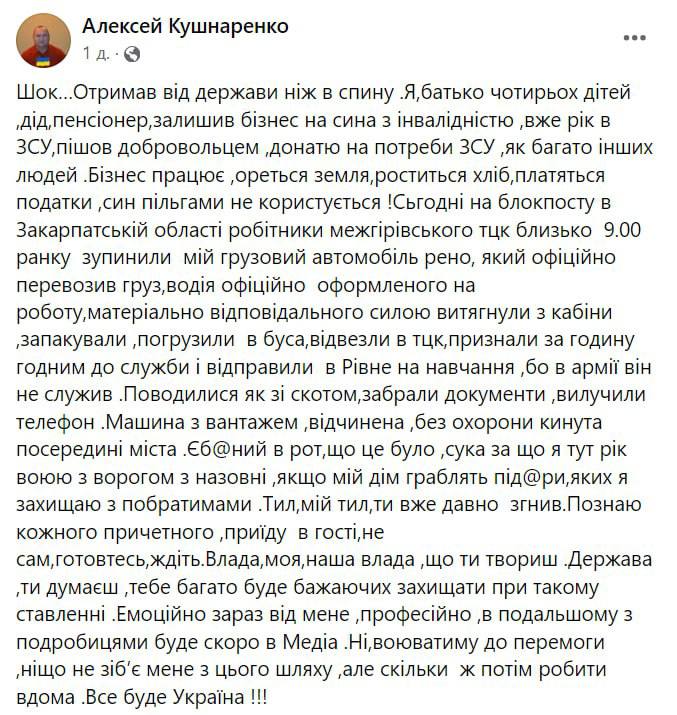 "Признали за час годным к службе и отправили в Ровно на учебу, потому что в армии он не служил. Обращались как со скотом, забрали документы, изъяли телефон. Машина с грузом, открытая, без охраны брошена посреди города", - написал Кушнаренко.
