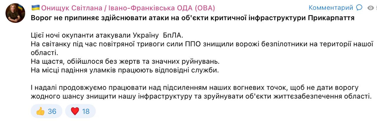 09.50 Ночью "Шахиды" атаковали критическую инфраструктуру Прикарпатья, сообщает ОВА.