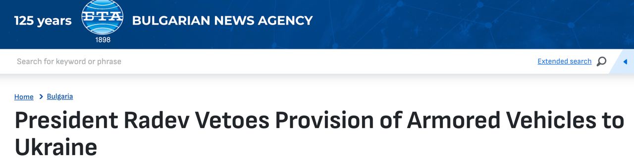 11.10 Президент Болгарии Румен Радев наложил вето на уже ратифицированное соглашение о безвозмездной поставке Украине 100 поддержанных бронетранспортеров, сообщают местные СМИ.