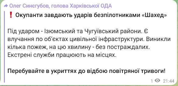 21.49 В Харьковской области после нанесения ударов "Шахедами" есть попадания по объектам гражданской инфраструктуры.
