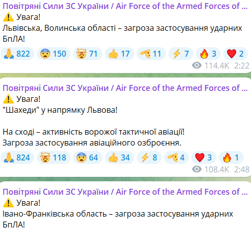 3.15 Ивано-Франковская область – угроза применения ударных БПЛА!", - говорилось в сообщениях ВС ВСУ.