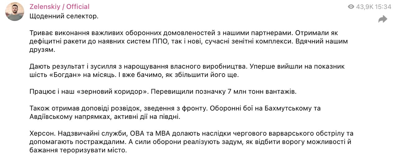Касательно ситуации на фронте президент заявил об обороне под Бахмутом и Авдеевкой и "активных действиях" ВСУ на юге.