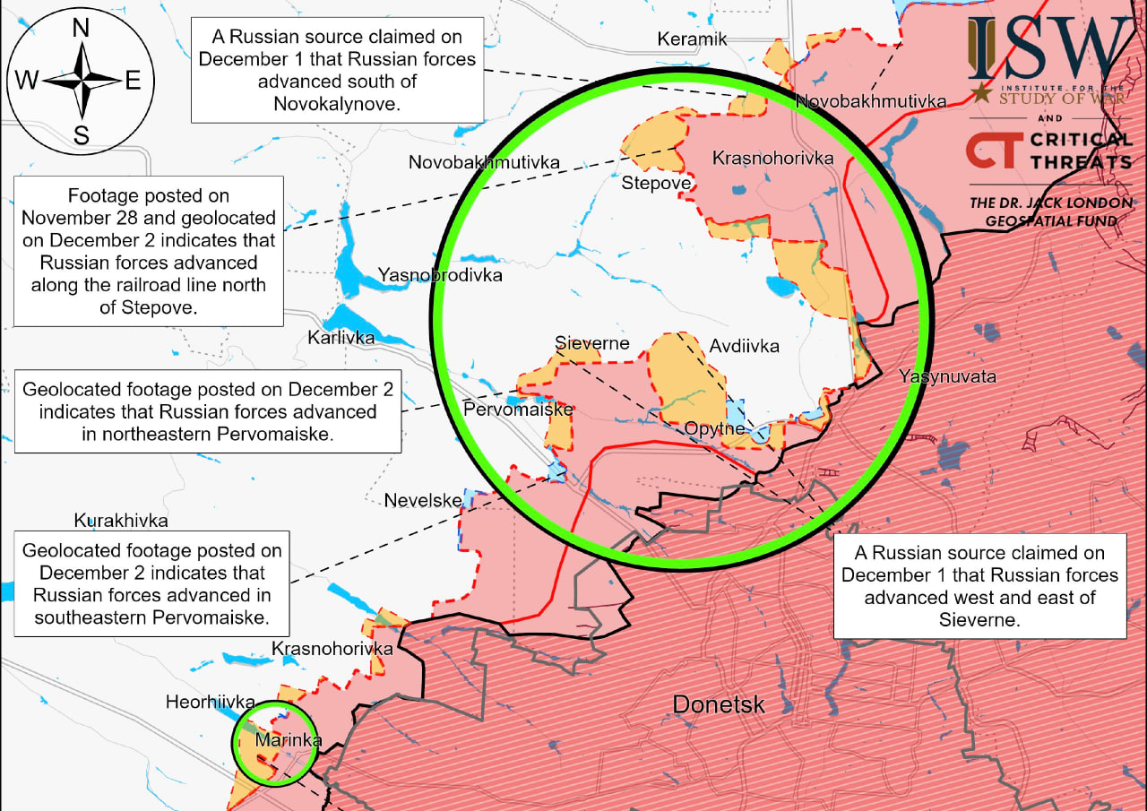Американский Институт изучения войны, изучив кадры в соцсетях, утверждает, что российские войска продвинулись к западу от железной дороги севернее села Степное (северный фланг).