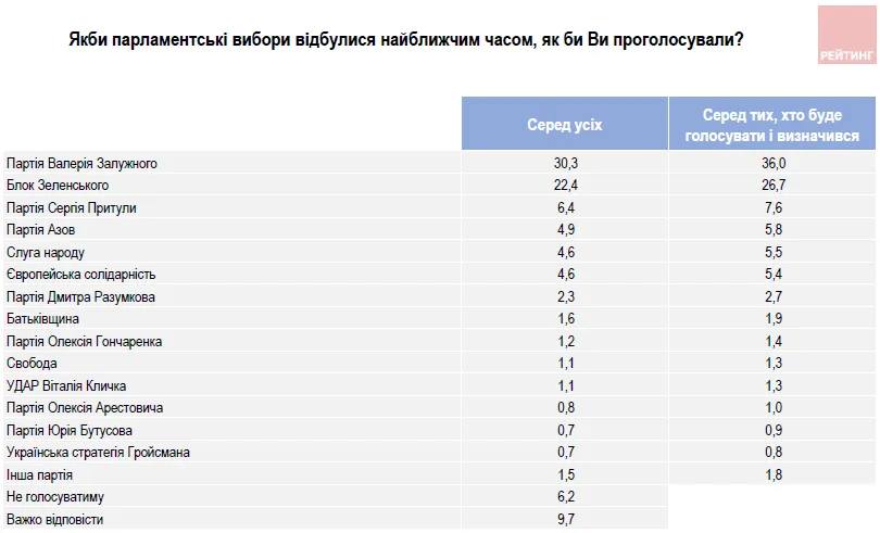 Согласно опросу, условная партия Залужного набрала бы 36% среди тех, кто пошел бы голосовать и определился с выборам.