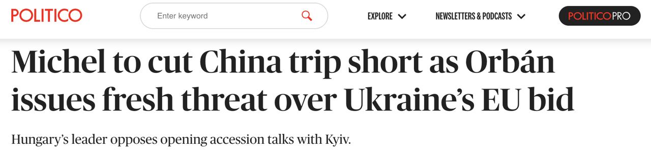 В письме от 4 декабря Орбан призвал Мишеля снять переговоры о вступлении Украины с повестки дня, чтобы избежать "провала" ввиду отсутствия консенсуса по этому вопросу.