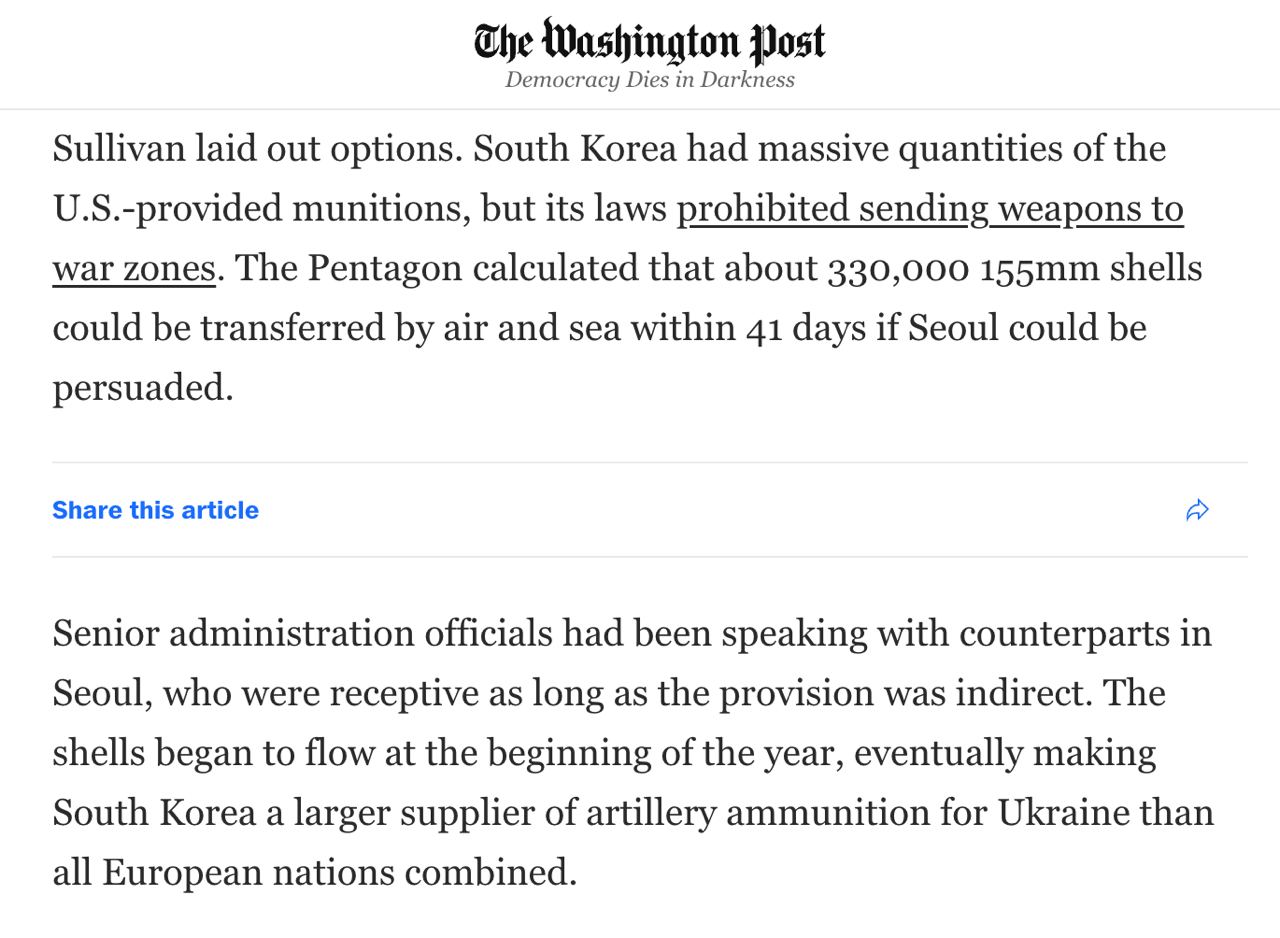 Южная Корея передала Украине больше артиллерийских снарядов, чем все европейские страны - The Washington Post