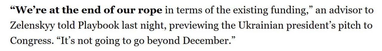 Politico со ссылкой на источник пишет, что американского финансирования Украине хватит до декабря