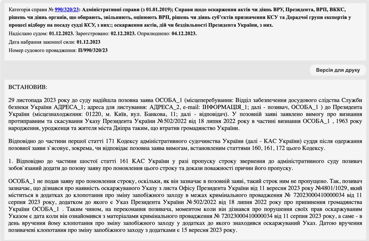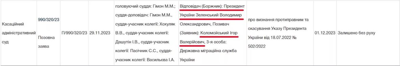 29 ноября Коломойский подал иск в Верховный суд о противоправности указа президента, датированного 18 июля 2022 года. Однако судьи требуют у него объяснить, почему он обратился только через полтора года после указа. Олигарх в ответ заявляет, что узнал о лишении его гражданства только в сентябре 2023 года - из документа об изменении ему меры пресечения.