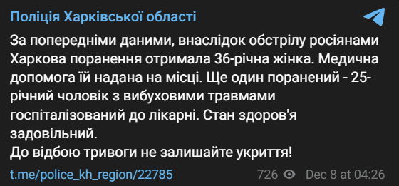 В полиции Харькова сообщили, что в результате обстрела россиянами Харькова ранения получила 36-летняя женщина. Медицинская помощь ей оказана на месте. Еще один раненый - 25-летний мужчина со взрывными травмами госпитализирован в больницу. Состояние здоровья удовлетворительное.