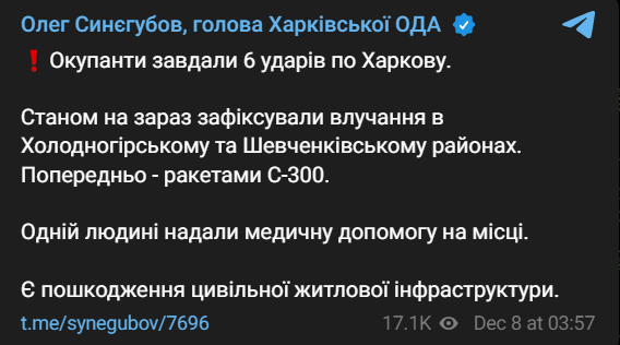 Об этом сообщает глава Харьковской ОВА Олег Синегубов.