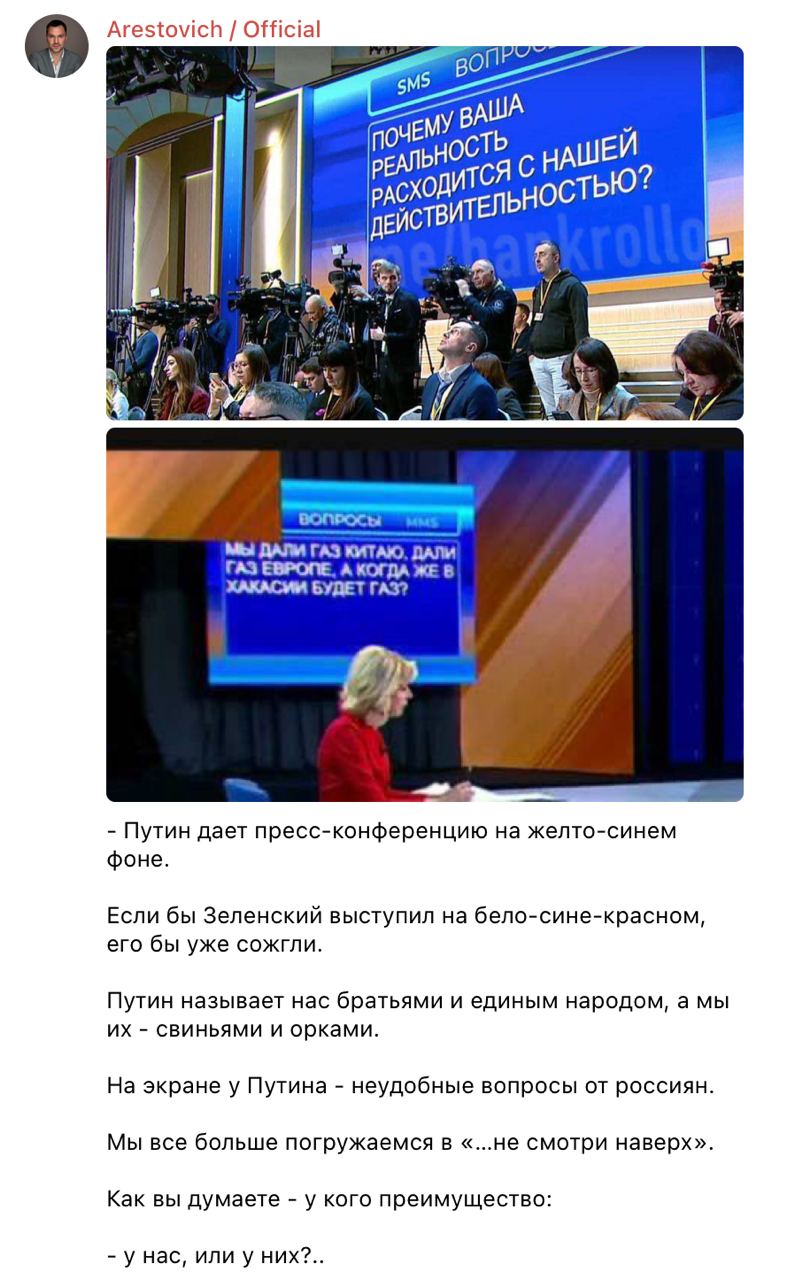 "Путин дает пресс-конференцию на желто-синем фоне. Если бы Зеленский выступил на бело-сине-красном, его бы уже сожгли. Путин называет нас братьями и единым народом, а мы их — свиньями и орками. На экране у Путина — неудобные вопросы от россиян. Мы все больше погружаемся в "...не смотри наверх". Как вы думаете — у кого преимущество: — у нас, или у них?..", — написал Арестович.