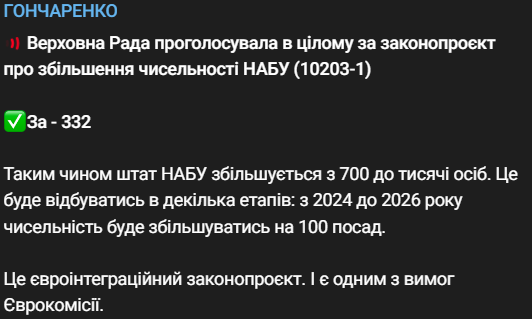 Верховная Рада поддержала в целом законопроект об увеличении численности НАБУ. За проголосовали 332 депутата.