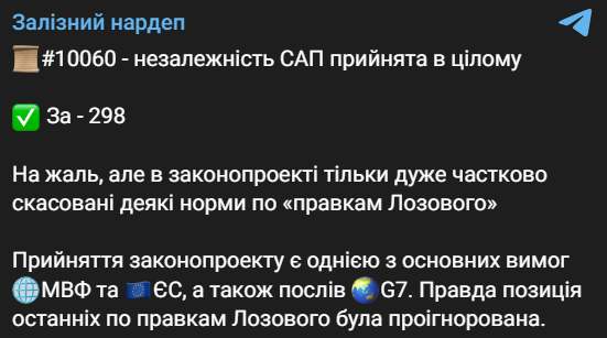 Кроме того, Верховная Рада приняла в целом законопроект о независимости САП. За проголосовало 298 депутатов.